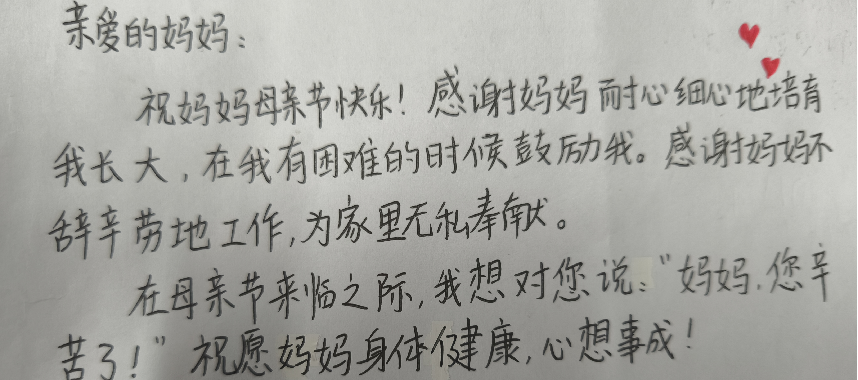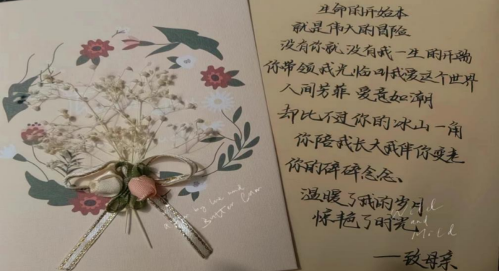 “人间芳菲,爱意如潮,却比不过你的冰山一角。你陪我长大,我伴你变老。你的碎碎念念,温暖了我的岁月。”这是一个女儿对母亲最深情的独白。另一封书信中这样写道:“祝妈妈母亲节快乐!感谢您细心培育我长大,在我有困难的时候鼓励我;感谢您不辞辛劳地工作,为家里无私奉献。妈妈,您辛苦了!祝您身体健康,心想事成。”简单的话语却更加令人动容。