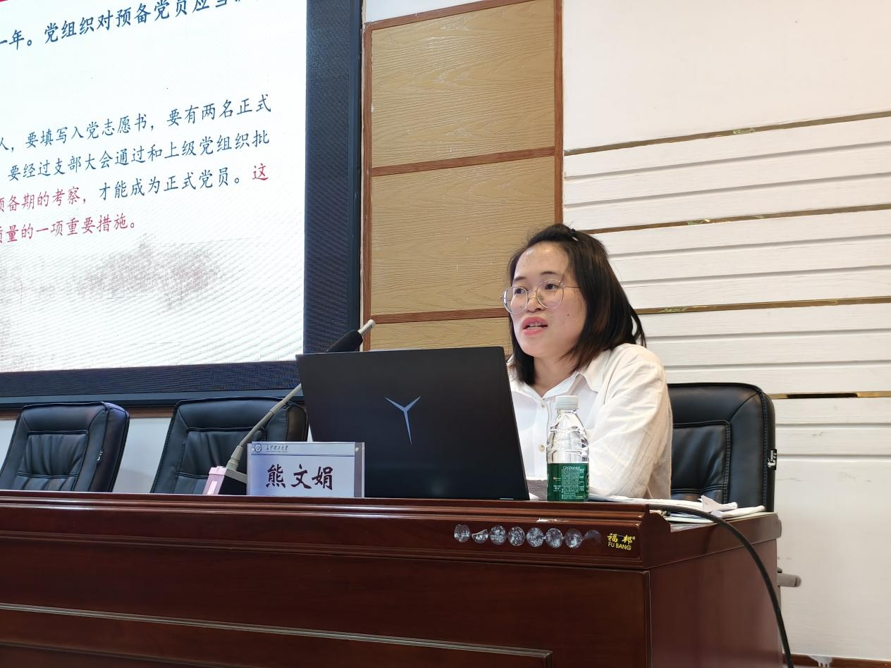 电气学院辅导员熊文娟以“过好预备期,做合格党员”为题,介绍了预备期的重要性和预备党员转正程序,阐述了党员的教育管理内容。她激励全体预备党员不忘初心牢记使命,加强思想政治建设,加固思想防线,保持入党积极性,过好预备期,早日成为一名合格的党员。