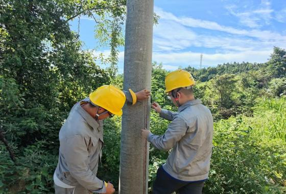 监理陈善移首先向队员们介绍了10kV配电台区的设备名称、基本功能,以及10kV/380V/220V配电线路,让队员们对10kV配电变压器、10kV配电网络有了初步的认识。队员的主要任务是测量电杆、拉线、架空线路的各项数据,并确认电杆埋设深度满足设计要求、拉线制作工艺标准化、线路架设后满足用户需求、达到安全运行标准。在监理陈善移的指导下,队员们开始对电杆进行测量,包括杆型、杆高、梢径、埋深、预偏角度、装设金具等关键信息,并进行数据记录。“质量验收工作关系到用户能不能用上安心电,所以务必要认真检查。”监理陈善移如是说。陈师傅的专业技能和严谨态度也让实践队员们深刻体会到了知识与态度在实际工作中的重要性。