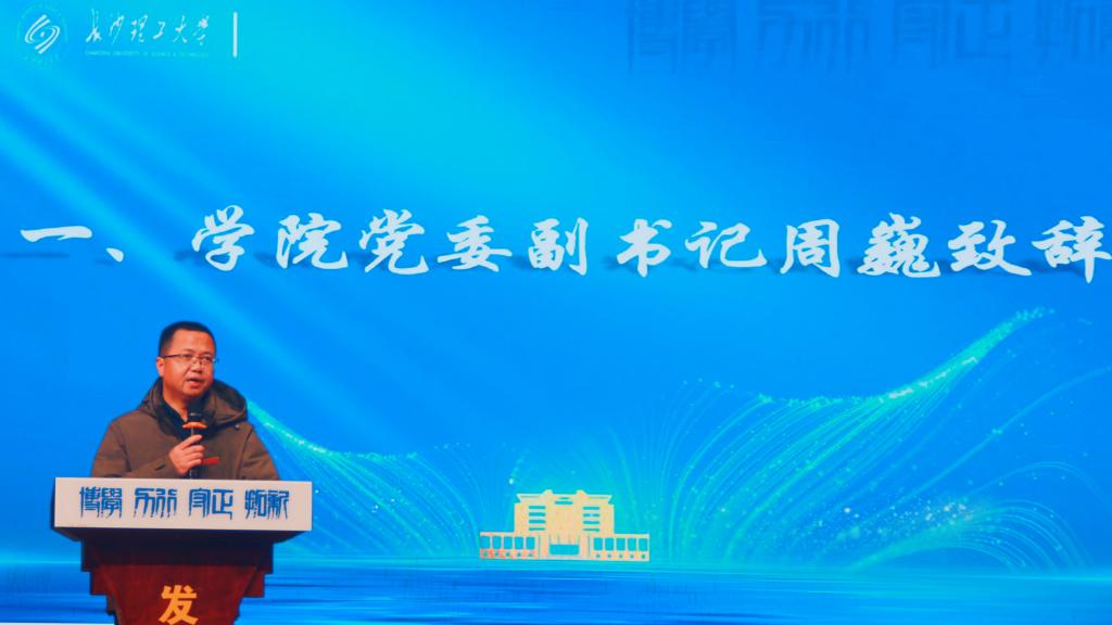 教师代表赵斌教授以“青春奋斗启新程,梦想扬帆正当时”为题,通过个人为学、为人、为事的亲身经历,从“大学是什么”“为什么要读大学”“怎么样读大学”三个方面做了主题报告分享。