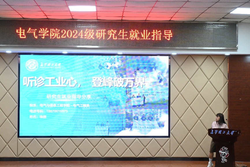 随后,楚艳鸽向同学们介绍了两位优秀毕业生代表——研究生国家奖学金获得者刘国胜和卓越研究生奖学金获得者徐丽,号召大家借鉴榜样经验,做好求职准备。签约长沙供电公司的刘国胜结合自身“科研竞赛+国网备考”经历,分享求职策略建议:简历需按岗位定制核心优势,备考注重理论与实操结合,面试前针对性研究单位业务重点。入职中车集团的徐丽以“校园大使+多段行业实习”经历为例,指出“与其追求广泛的荣誉积累,不如让专业研究与目标岗位的技术需求深度对接”,建议通过参与校企联合项目、企业实习等方式,积累与岗位直接相关的可量化成果,切实提升自身与企业需求的契合度。