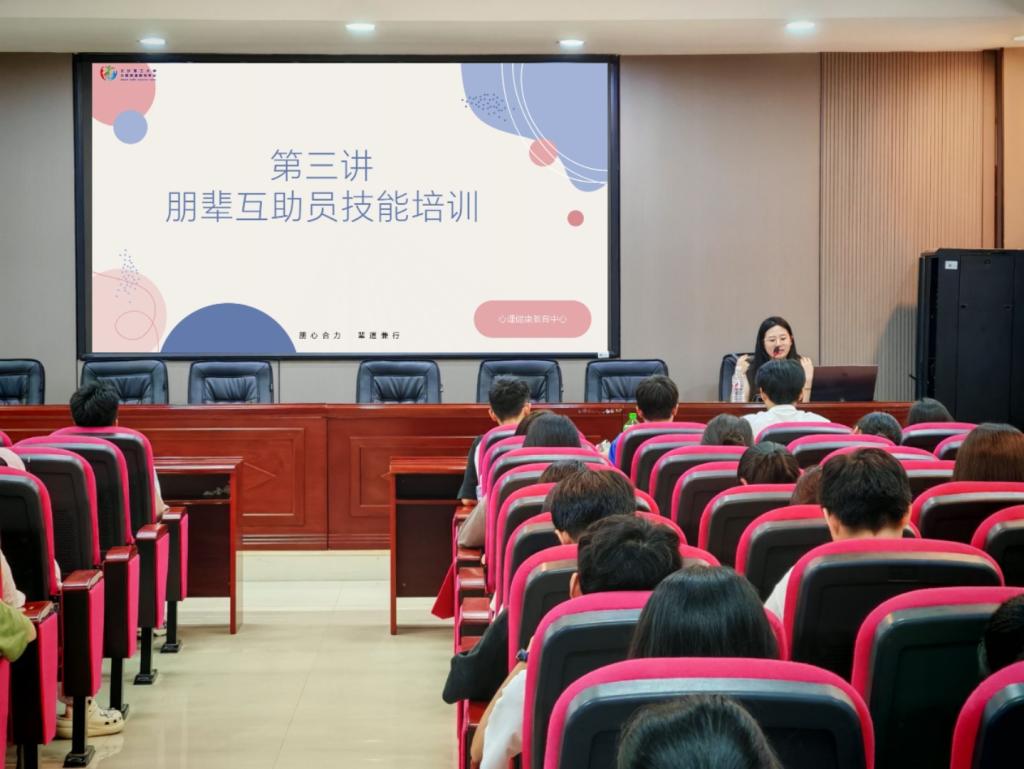 培训围绕朋辈心理互助的核心技能展开。曾玮怡首先带领同学们回顾了高校朋辈心理辅导的发展历程及其重要价值,明确了朋辈互助员“真诚、共情、陪伴、转介”的工作原则。随后,培训重点聚焦于“朋辈助人技巧”,详细讲解了以罗杰斯“以人为中心疗法”为基础的核心态度:真诚、无条件积极关注、共情和尊重。此外,还深入介绍了关键的倾听技术以及针对特殊情况的陪伴技术。