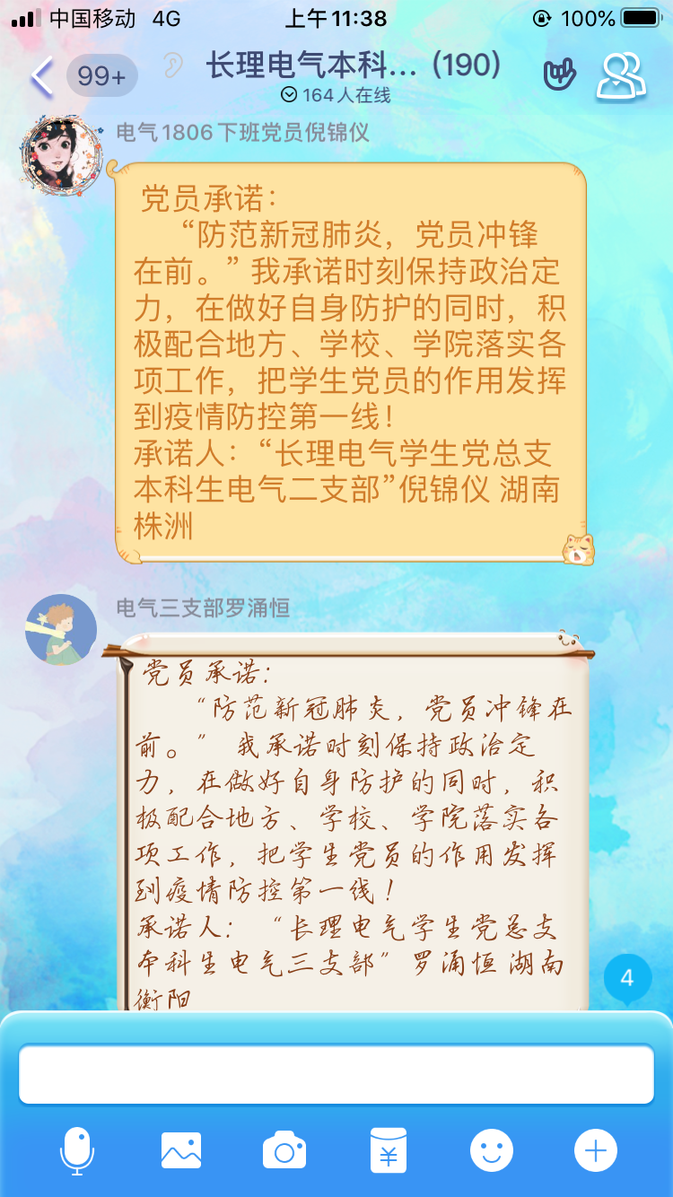 “防范新冠肺炎,党员冲锋在前。我承诺时刻保持政治定力,在做好自身防护的同时,积极配合地方、学校、学院落实各项工作,把学生党员的作用发挥到疫情防控第一线!让党旗在疫情防控斗争第一线高高飘扬!”2月5日晚,湖北籍学生的QQ群里响起了学生党员整齐划一的承诺声。