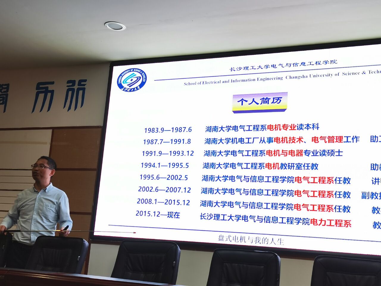 周教授向师生们阐述了盘式电机结构、原理及应用,介绍了自己的人生历程和自己的博士生导师。