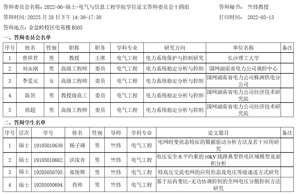 电气与信息工程学院2022年6月毕业研究生答辩安排(十四)已发布,请相关同学提前打印准备好《答辩表决票》、《答辩安排表》、《答辩申请表》,于答辩前5个工作日提交得到工一B501研究生办完成盖章并做好相关答辩准备。