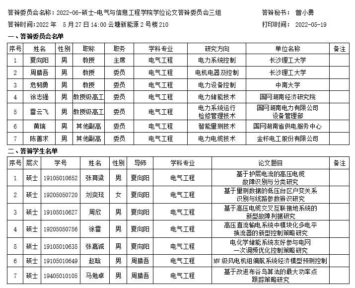 电气与信息工程学院2022年6月毕业研究生答辩安排(三)已发布,请相关同学提前打印准备好《答辩表决票》、《答辩安排表》、《答辩申请表》,于答辩前5个工作日提交得到工一B501研究生办完成盖章并做好相关答辩准备。