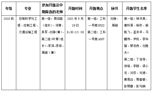 控制科学与工程、控制工程学科一组和交通运输工程组开题及中期筛选考核安排已公示,请大家提前填写好《LETOU体育平台研究生论文开题报告表》与《研究生中期筛选考核评定表》,做好答辩准备。