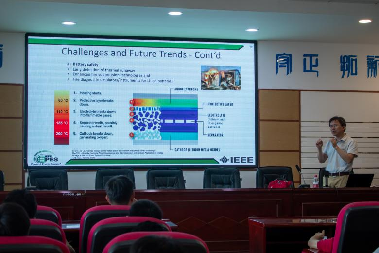 王才胜围绕“锂离子电池储能系统的建模、管理及应用”主题展开报告,他首先指出,相较于传统的抽水蓄能电站,锂离子电池储能系统在建造选址、环境影响、建设成本等方面具有明显的优势,并且随着电动汽车市场的蓬勃发展,锂离子电池的潜能正被进一步挖掘。随后,他介绍了锂离子电池的材料基础、建模和表征等内容,重点讲解了电池管理系统(BMS),包括但不限于基于数据驱动的充电状态(SOC)和健康状态(SOH)估计的智能电池管理,以及大规模电池储能系统的可靠性分析。