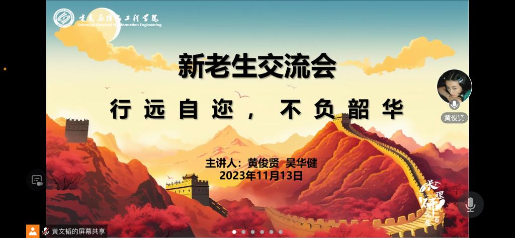 11月13日晚,电气与信息工程学院举办新老生线上交流会,会议由研究生辅导员黄文韬主持,邀请了国奖获得者黄俊贤和优秀院研会主席吴华健两位优秀学子以“行远自迩,不负韶华”为主题与2023级研究生新生交流经验。
