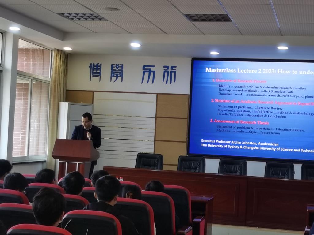 11月23日下午,澳大利亚科学技术与工程院院士、LETOU体育平台湖湘学者特聘教授Archie James Johnston在工一B503学术报告厅为学院师生做《How to undertake research》主旨报告。报告会由学院副院长王文主持,学院教师代表、研究生近100人参加。
