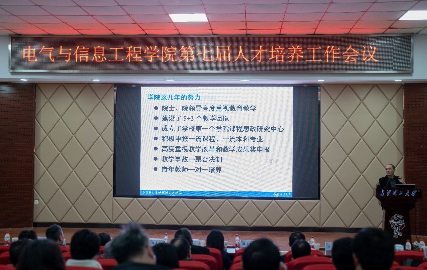 曹一家通报了2023年学校各项工作的基本情况,肯定了学院一年来的工作成效。他指出,学院要抓住电气工程学科进入学校“1+2”学科布局、冲击一流学科的重大战略部署机遇,迎难而上,为建设“百强”大学贡献更多的电气力量。他希望,每一位教职工牢记“为党育人、为国育才”的初心使命,不负韶华,立志做科教兴国