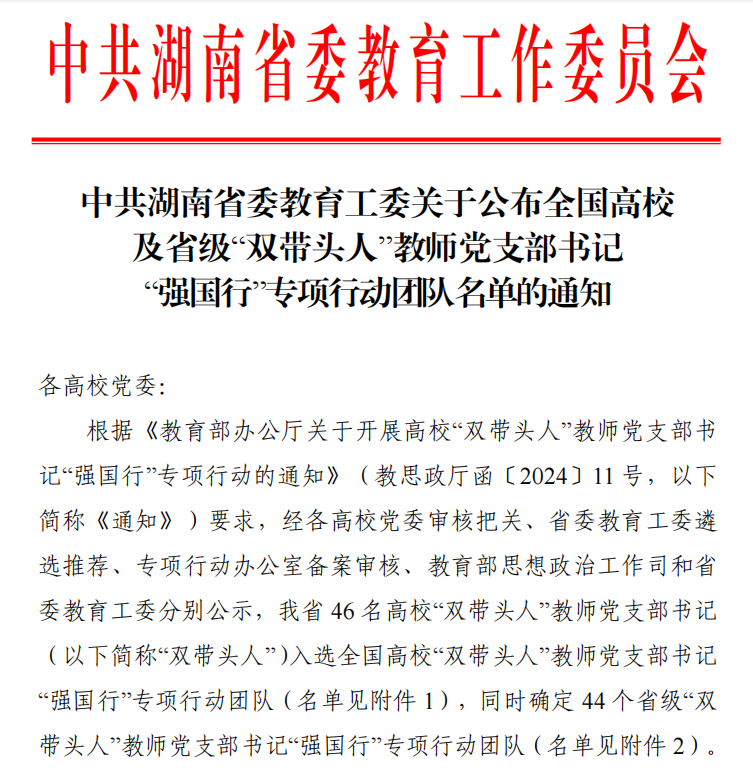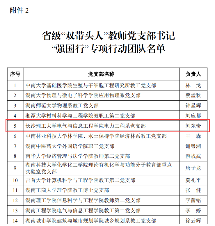 近日,中共湖南省委教育工委印发通知,公布了全国高校及省级“双带头人”教师党支部书记“强国行”专项行动团队名单。LETOU官网入选全国及省级团队各一个。我院电力工程系党支部书记刘东奇同志被确定为省级“双带头人”教师党支部书记“强国行”专项行动团队。
