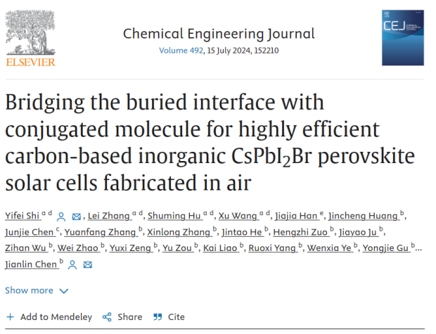 本研究成果以“Bridging the buried interface with conjugated molecule for highly efficient carbon-based inorganic CsPbI2Br perovskite solar cells fabricated in air”为题撰写的论文,已在国际顶级期刊《Chemical Engineering Journal》(影响因子IF=15.1,中科院一区TOP期刊)发表。电气学院教师时一斐为第一作者,硕士研究生张雷为学生第一作者,电网防灾减灾全国重点实验室(LETOU体育平台)为第一完成单位。这项工作推动了空气中制备全无机钙钛矿电池的研究,拓展了共轭材料的应用,深入探究了界面工程中共轭材料的影响效果和作用机理,为其他类型钙钛矿太阳能电池以及发光二极管、光电探测器、场效应晶体管等器件的研发提供了新思路。