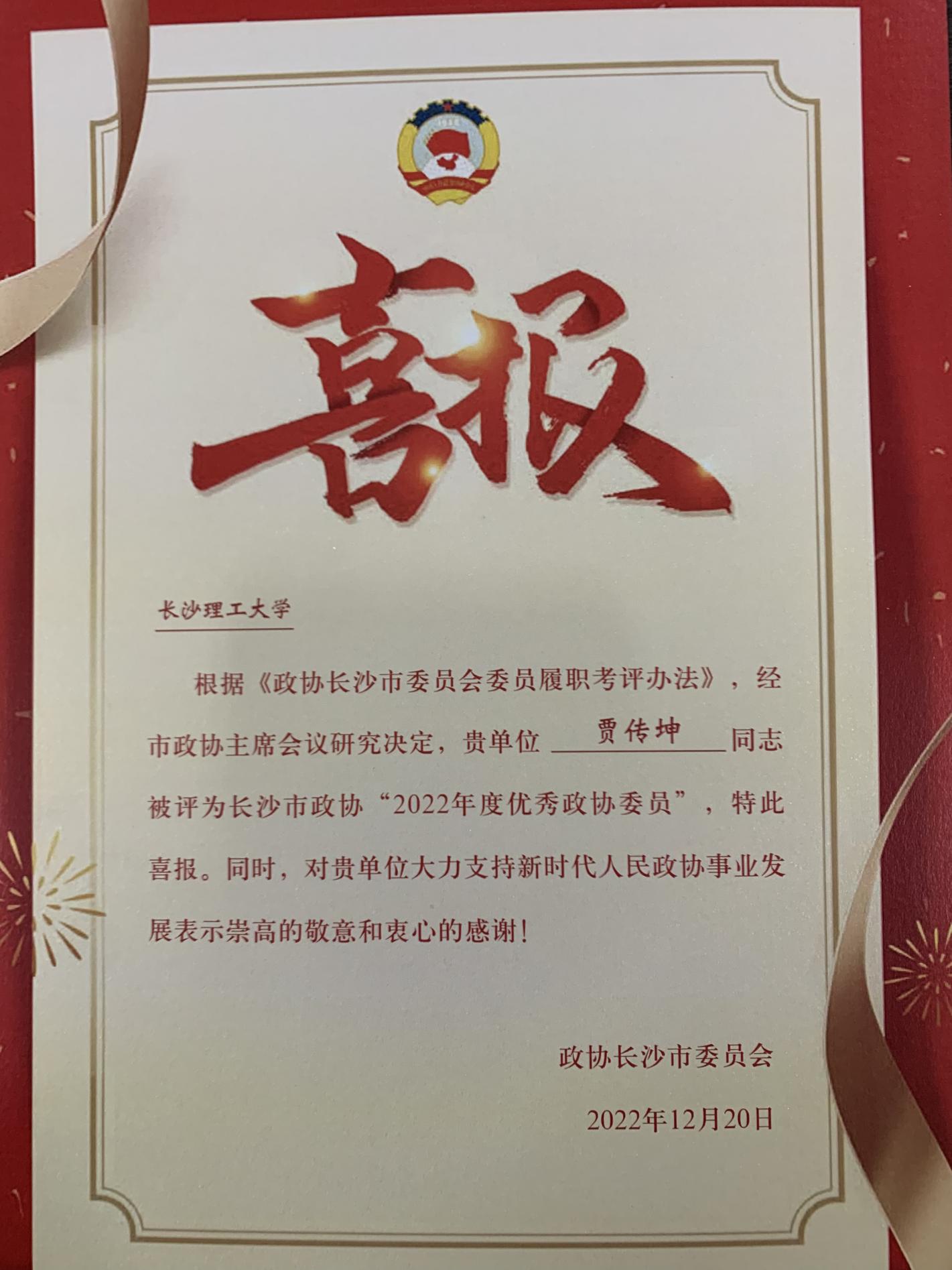 根据《政协长沙市委员会履职考评办法》,经市政协主席会议研究决定,LETOU官网贾传坤教授被评为长沙市政协“2022年度优秀政协委员”。