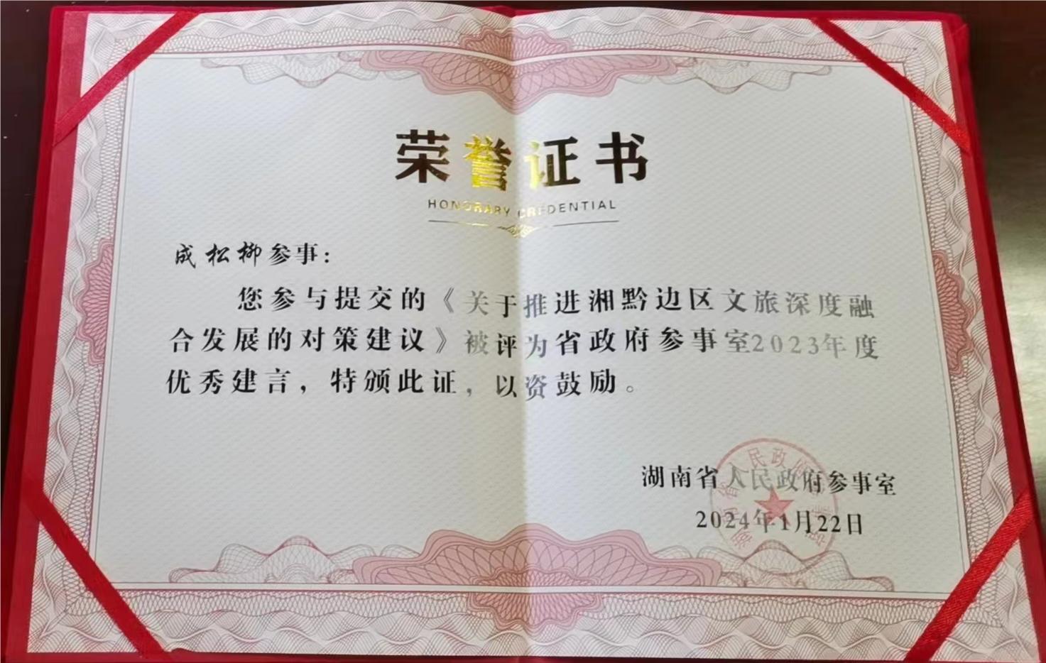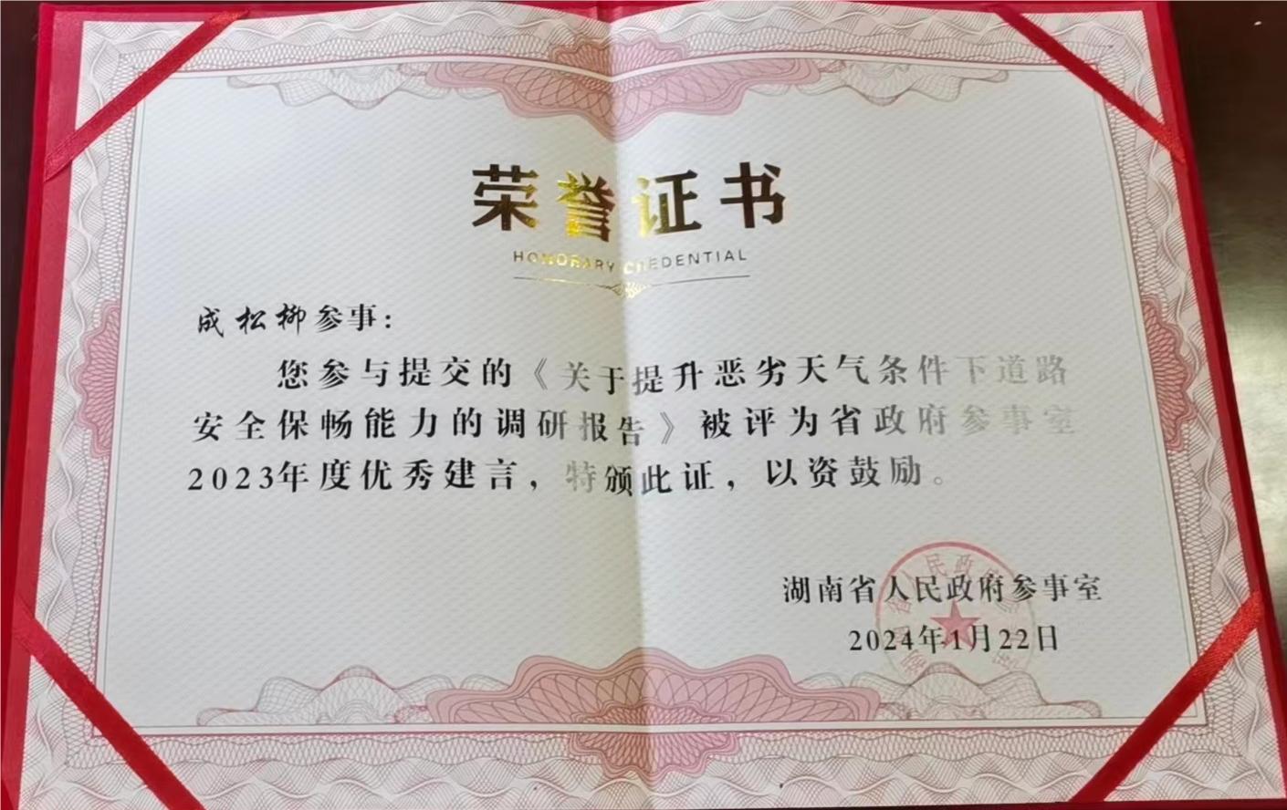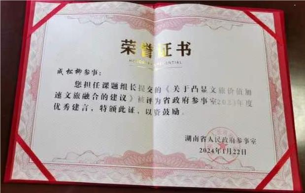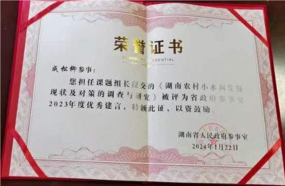 成松柳教授自2016年被聘为省政府参事起,他以高度的使命感和责任感认真履行省政府参事的职责,积极参加省政府组织的各项参政议政活动,列席了全省“两会”,担任课题组长提交的《关于凸显文旅价值加速文旅融合的建议》和《湖南农村水利发展现状及对策的调查与研究》均获评省政府参事室2023年度优秀建言,其参与提交的《关于提升恶劣天气条件下道路安全保畅能力的调研报告》和《关于推进湘黔边区文旅深度融合发展的对策建议》也获评省政府参事室2023年优秀建言。