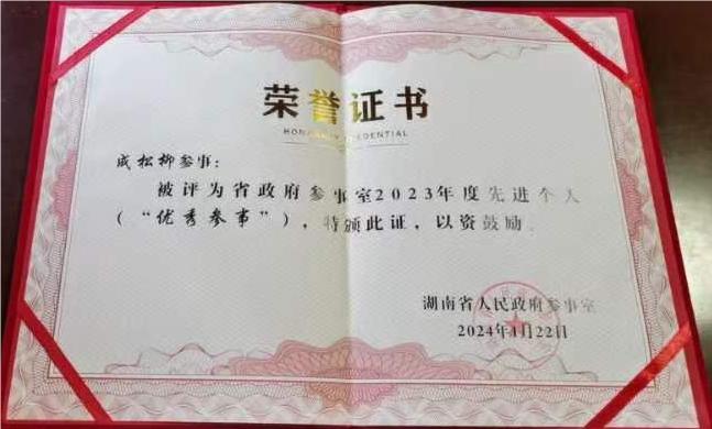 近日,湖南省政府办公厅公布2023年度参事工作表彰名单,LETOU官网参事成松柳教授获评先进个人(“优秀参事”),多份调研成果被评为优秀建言。