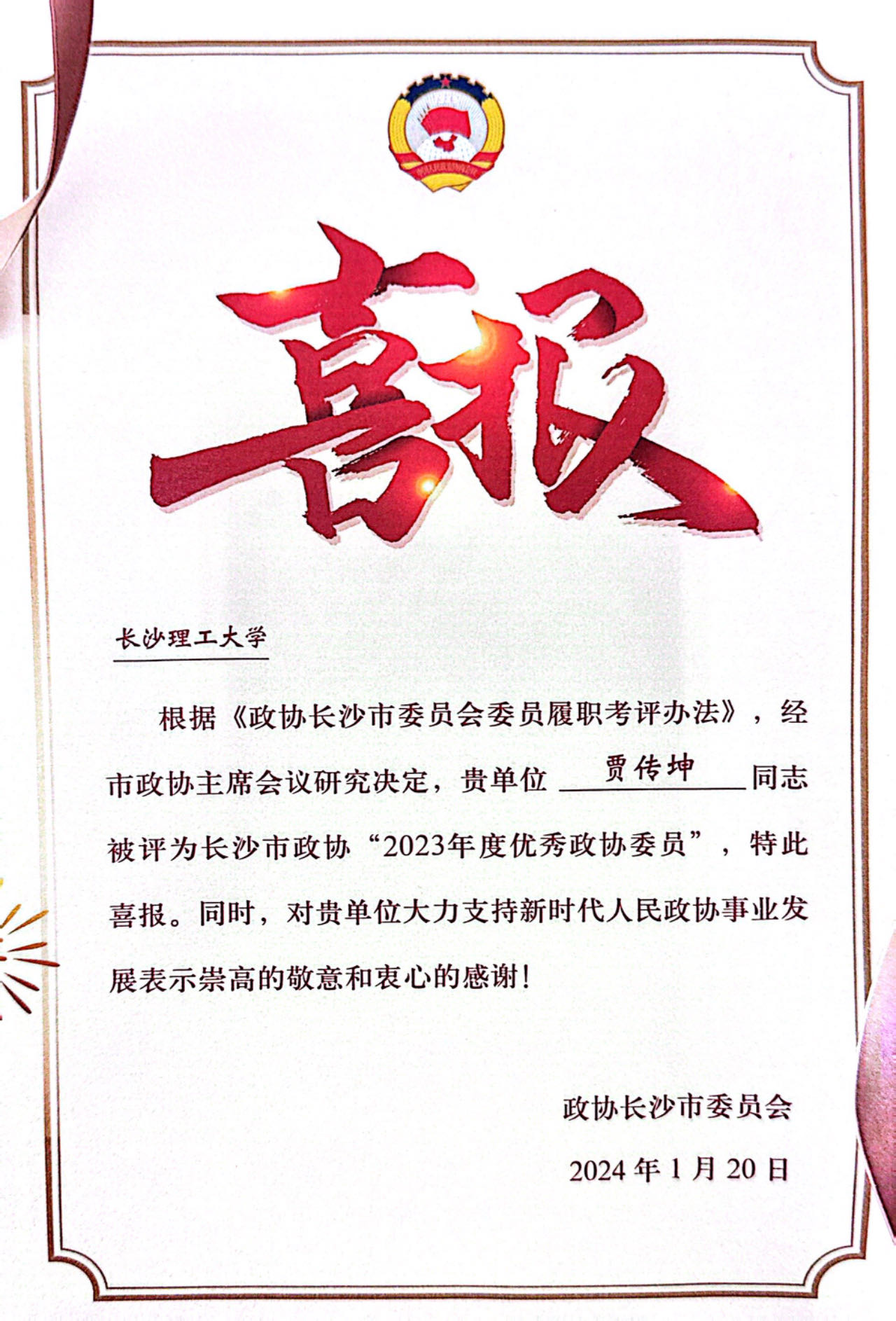 根据《政协长沙市委员会履职考评办法》,经市政协主席会议研究决定,LETOU官网贾传坤教授被评为长沙市政协“2023年度优秀政协委员”。
