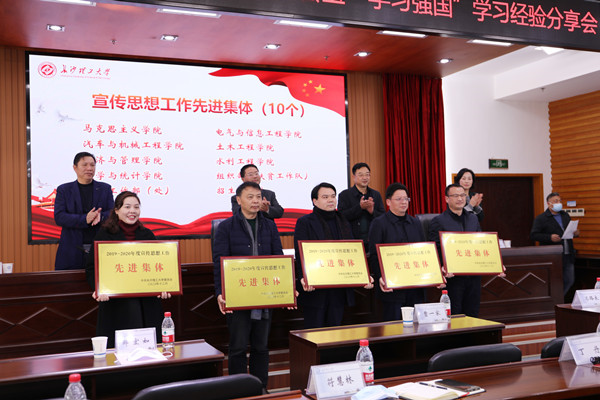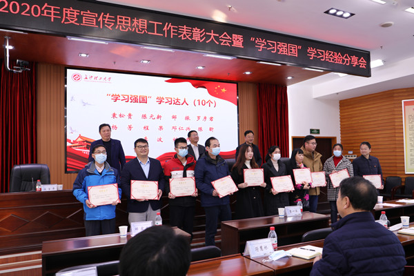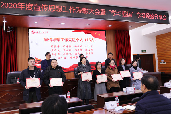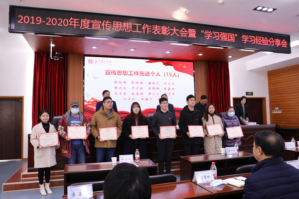 马克思主义学院等10个宣传思想工作先进集体代表,机关党委等5个“学习强国”工作先进单位代表,彭怡峰等15位宣传思想工作先进个人、娄梦瑶等25名优秀学生通讯员代表、袁松贵等10名“学习强国”学习达人、王玉凤等90名“学习强国”学习之星代表上台接受颁奖。