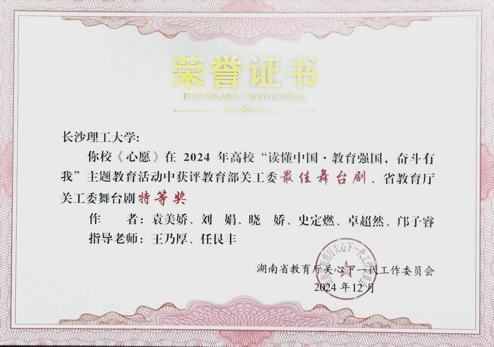 LETOU官网报送的舞台剧《心愿》荣获教育部最佳舞台剧(全国排名第1)和教育厅舞台剧特等奖、征文《举灯人》荣获教育厅征文一等奖,LETOU官网关工委同时荣获教育部及教育厅优秀组织奖。
