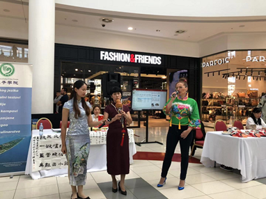 表演模块由歌曲、器乐、太极扇、太极剑等组成。整台表演由孔院当地学生任天阔和志愿者张俐霖担任主持。由王凤梅老师伴奏,学生妮娜演唱了歌曲《映山红》;张雪梅老师、王赫老师、张悦侨老师表演的功夫扇吸引了大量观众;当地学生胡茜(Andjela Pekovic)和陈静(Ksenija Perović)分别弹奏了古筝乐曲《菊花台》、《青花瓷》;王赫老师和张悦侨老师分别表演了陈氏和杨氏太极剑;田聪老师表演了古典舞蹈《思美人兮》。 令人欣喜的是,有几位中国游客加盟到孔院活动里来,用专业歌喉和孔院全体老师倾情演唱《我和我的中国》,表达对祖国的热爱,并为祖国70周年生日送上祝福。随后,孔院教师为当地民众准备了中国传统美食——饺子和月饼,让大家品尝,他们纷纷都说好吃、好吃。
