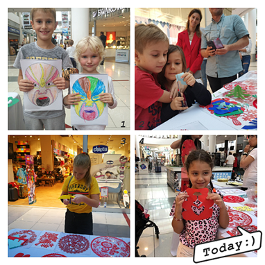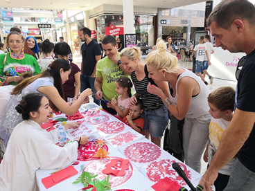 其中,展台部分分为剪纸、书法、筷子游戏和服装试穿等项目,每个展台分为两个环节——展示环节和体验环节。在剪纸展台,孔院教师向当地民众展示了不同样式的剪纸,并且介绍了每种样式的寓意,以及中国的风俗习惯等。当地民众热情很高,对剪纸充满了兴趣。