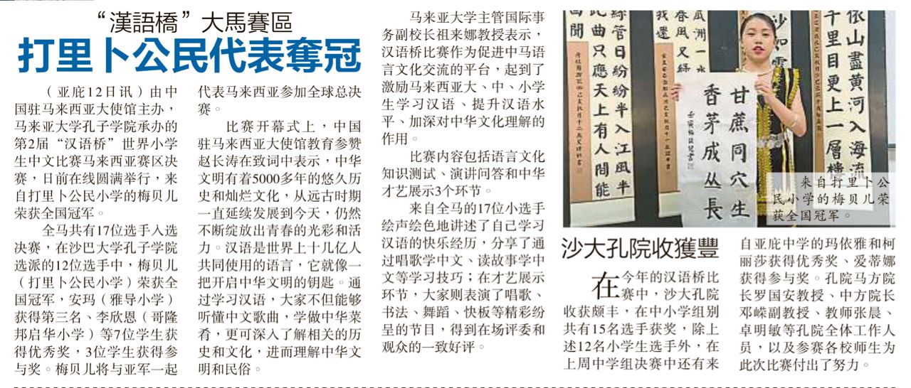 6月11日,来自沙大孔院的小选手梅贝儿夺得第2届“汉语桥”小学生中文比赛马来西亚赛区冠军,《亚洲时报》《星洲日报》等多家媒体对此进行了报道。本年度“汉语桥”比赛沙大孔院收获颇丰,在中小学组别共有15位选手获奖,引起广泛社会关注。连日来多所学校与机构前来孔院接洽文化活动合作事项。