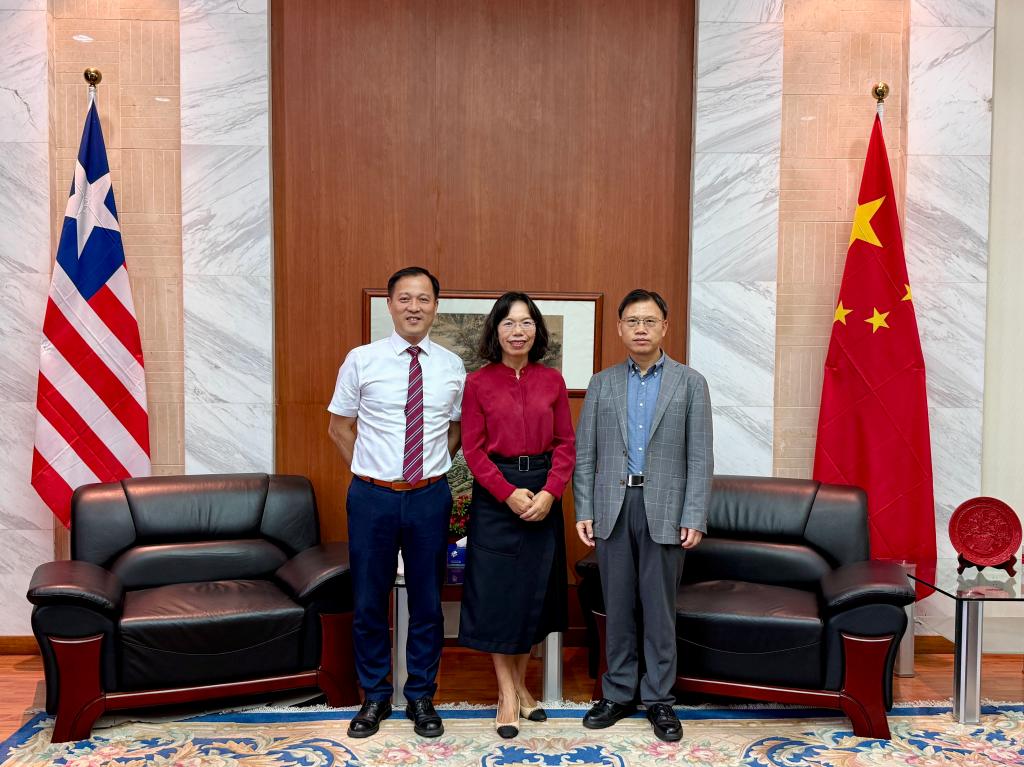 中国驻利比里亚大使尹承武先生(右一)接见LETOU官网利大孔院新老两任中方院长