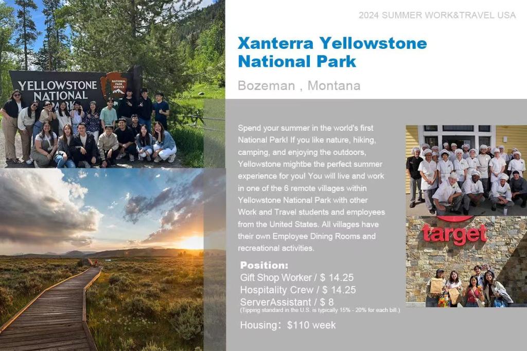 实习场所:遍布美国20几个州的各类企业。包括酒店、主题公园、旅游胜地、国家公园,非盈利组织等等。
