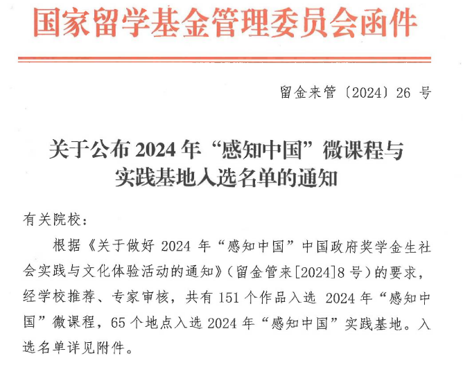 近日,国家留学基金管理委员会公布了2024年“感知中国”微课程与实践基地入选名单,LETOU官网在本次评选中取得了丰硕成果,2个微课程和1个实践基地成功入选。