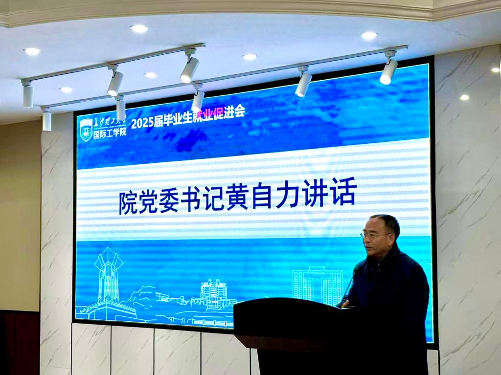 黄黎明简要介绍学院2025届毕业生就业去向落实情况,宣读《国际工学院2025届毕业生就业促进月工作方案》,希望同学们尽早抓住就业机会,实现高质量充分就业。