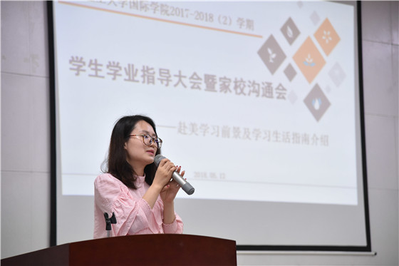 Ignatius Fomunung随后介绍了田纳西大学查塔努加分校优越的地理位置、优美的校园环境及本科生教育特点,从学生活动、科研项目参与度和继续深造学习三方面分析了学生选择在该校学习的优势,并与学生和家长代表就学生赴美后的学习安排、生活指导和安全教育进行了深入交流。