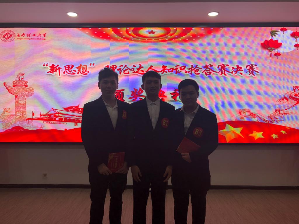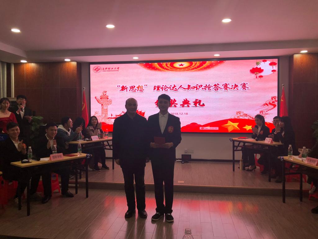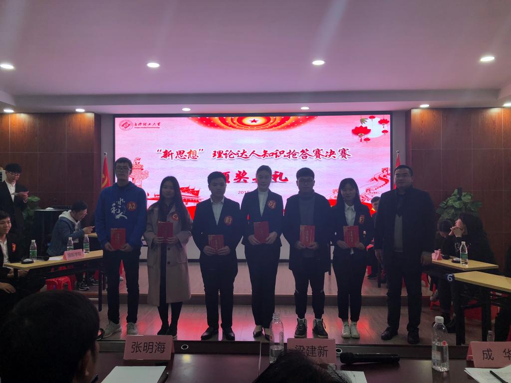 12月18日晚,由校学生工作部(处)主办的LETOU体育平台“新思想”理论达人知识抢答赛决赛在云塘校区工三B319举行。校宣传部、学生工作部(处)等部门负责人和马克思主义学院专家担任大赛评委。2016级学生张微东、刘柯、郭洋代表学院参赛,在决赛中发挥出色,以团体总分第一名的成绩夺得冠军,其中郭洋获评最佳选手。