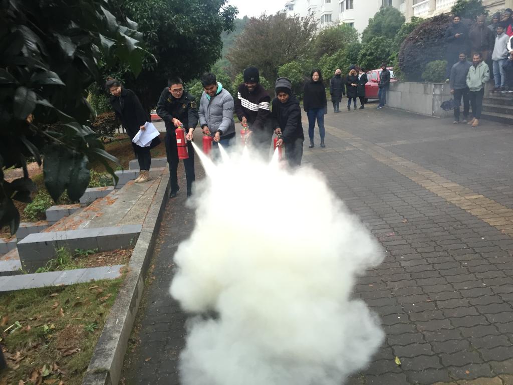 讲座结束后,同学们在留学生公寓前坪集合,吴教官带领大家模拟火灾现场进行了灭火实战演练。同学们踊跃参与,运用刚刚掌握的消防知识和技能,体验操作干粉灭火器扑灭“火情”,灭火演练过程紧张而有序。