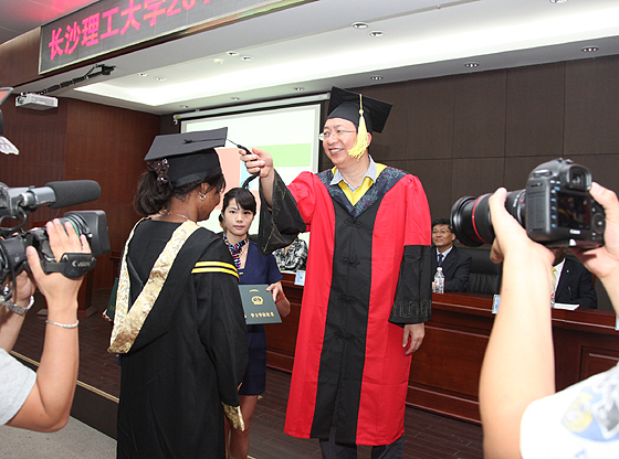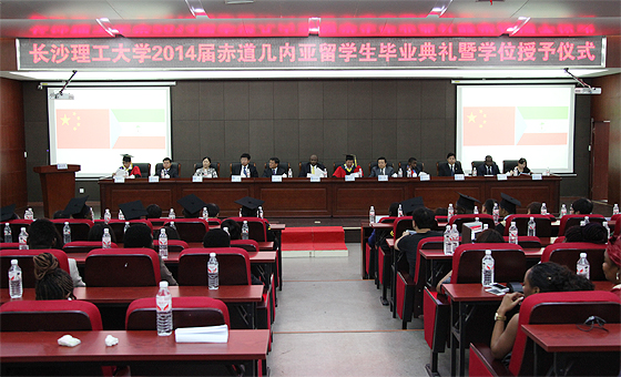 7月3日上午,LETOU官网2014届赤道几内亚留学生毕业典礼暨学位授予仪式在云塘校区国际学术交流中心隆重举行。赤道几内亚共和国公共工程及基础设施部长胡安·恩科·姆布拉、驻中国大使馆一秘辛弗里亚诺·埃拉·阿塞克·阿贝格、交通部国际司司长杨赞、湖南省外事侨务办副主任邱爱华、湖南省交通运输厅副巡视员徐建、中国交通建设股份有限公司总裁助理、中国路桥工程有限责任公司董事长文岗、中国交通建设股份有限公司海外事业部总经理陈重、LETOU官网党委书记付宏渊、副校长杨伟军等出席典礼。LETOU官网在校留学生和部分师生代表共200余人参加典礼。
