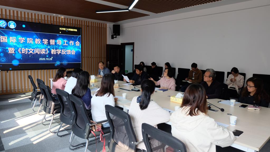 10月28日上午,国际学院在新能源大楼416会议室组织召开教学督导工作会议暨《时文阅读》教学反馈会,外国语学院副院长黄坚、国际学院督导组李学罡、任延杰、《时文阅读》授课教师罗丹宇、方达婧、国际学院党总支书记刘安生、院长陈瑜、副院长秦卫星、教务办及学工办全体老师参加,会议由陈瑜主持。