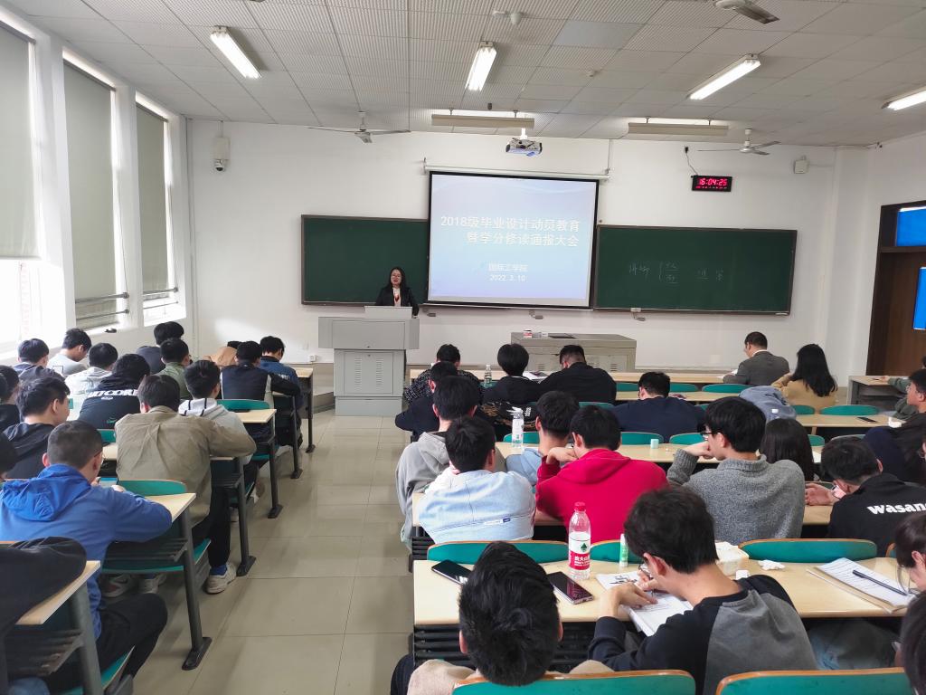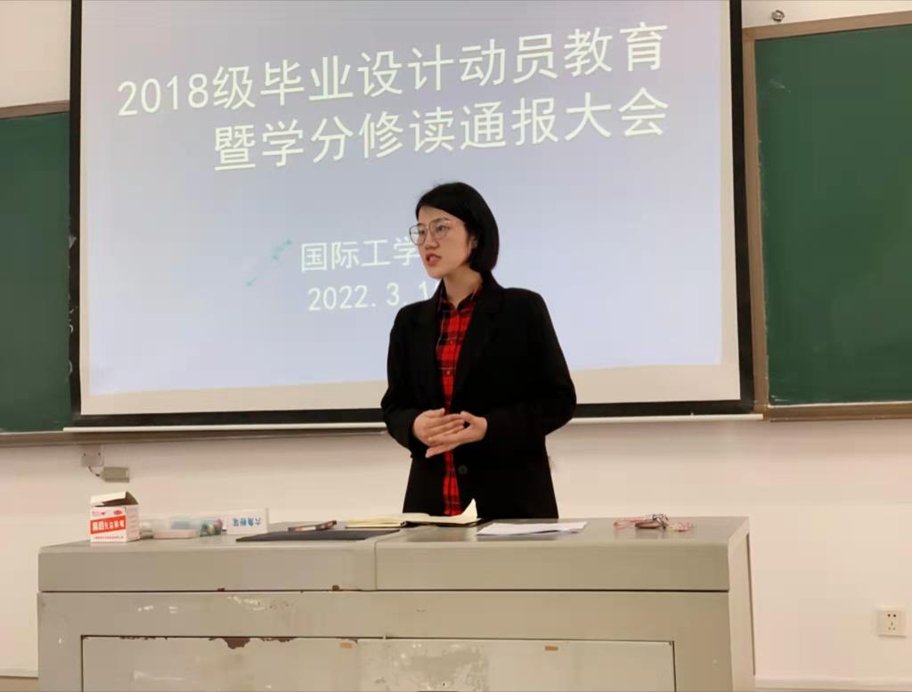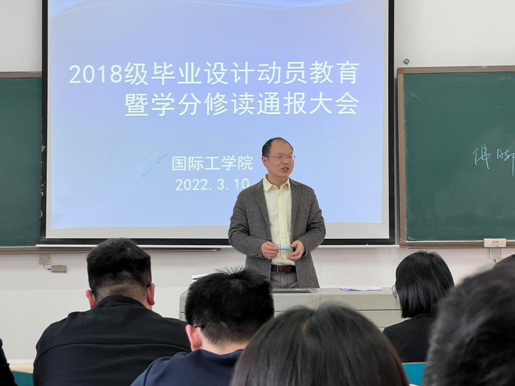 为更好推进中外合作办学项目(土木工程专业)2018级学生的毕业设计、学分修读及毕业教育各项工作,帮助2018级学生圆满完成本科阶段学业,国际工学院于3月10日下午在云综教B205组织召开2018级毕业设计动员教育暨学分修读通报大会。国际工学院副院长秦卫星,学工办和教务办相关老师参会,会议由教务办负责人罗帅主持。