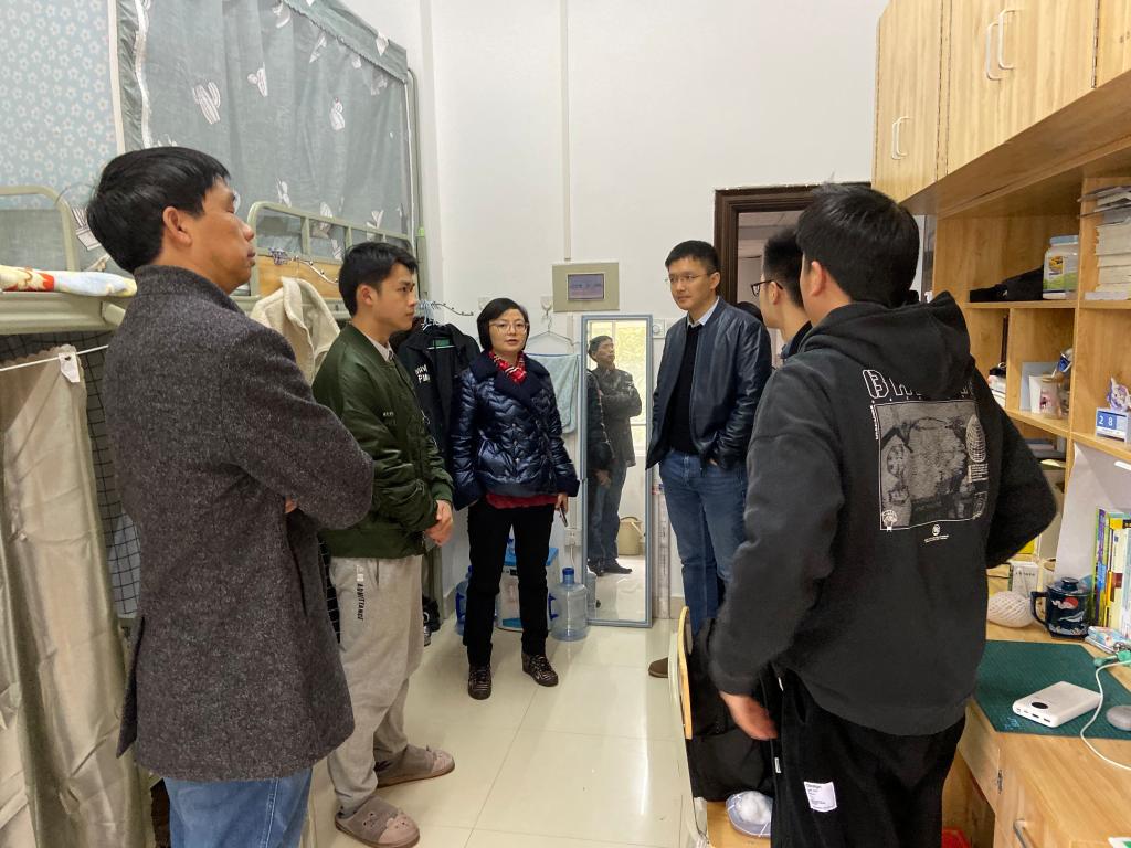 2020年2月28日,国际学院党总支书记刘安生、院长陈瑜、党总支副书记兼副院长张锐,以及学工办老师深入学院学生寝室,看望学生。