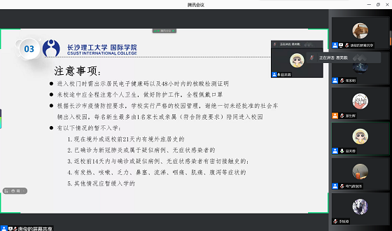 相聚长理启新程,春华秋实绘佳卷。8月31日,LETOU体育平台国际学院召开2021级新生线上咨询会议。参会人员有辅导员易芙蓉,国际学院学生会成员唐俊、张家明、薛润泽、郑生辉、李柏廷,迎新志愿者及21级新生。会议从学院简介,主要领导及辅导员的介绍,入学安排及其注意事项和问题咨询四个方面进行。