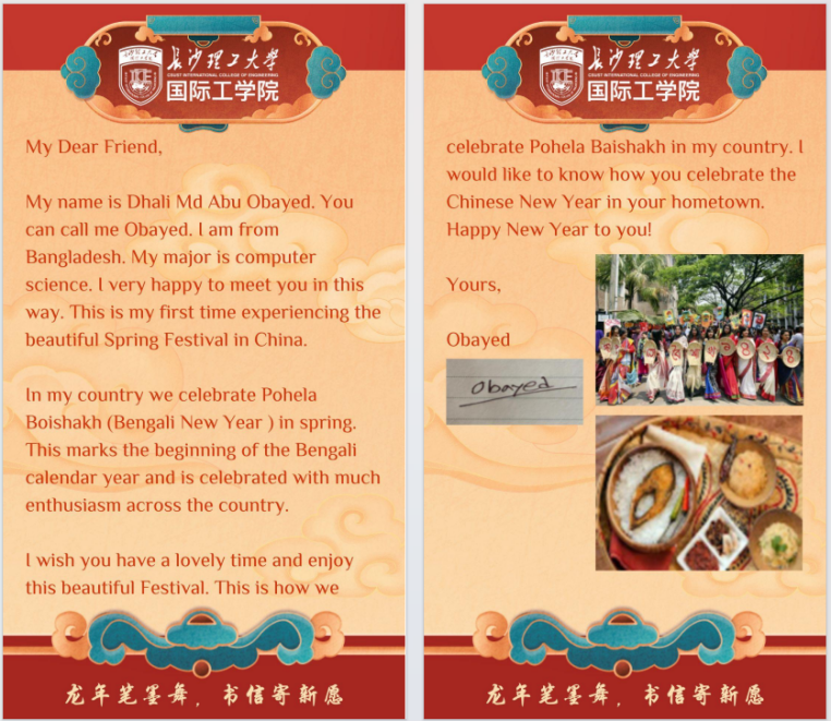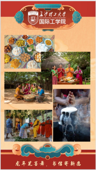 来自孟加拉国、斯里兰卡、也门等多个国家的留学生也以图文形式分享自己家乡的新年习俗,同时祝愿中方学生和家人朋友们“龙年大吉”。来自斯里兰卡的魏冉分享了在新年到来之际斯里兰卡人民制作“kiribath”“kovum”“kokis”等传统美食的习俗。在长沙度过了第二个春节的妮莎则分享了自己在学院举办的新春活动中体验汉服、演唱中文歌的经历,表达了自己对中华优秀传统文化的喜爱。活动在浓厚的春节氛围与中外交流中落下帷幕。