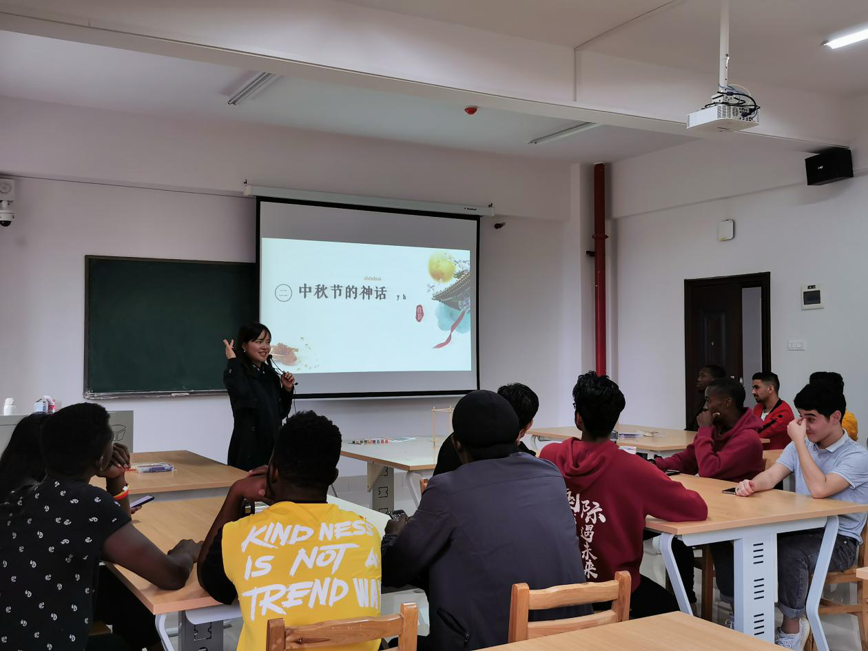 活动中,留学生教学部汉语教师冀文秀首先向同学们介绍中秋节的起源和背景故事,并分享与节日有关的中华诗词,“嫦娥奔月”、“人有悲欢离合,月有阴晴圆缺”,在老师讲解的神话故事与诗词歌赋中,同学们了解了中秋佳节的习俗与意义。活动还特别设置了有奖竞答环节,同学们积极抢答,赢得了剪纸、中国结等奖品。