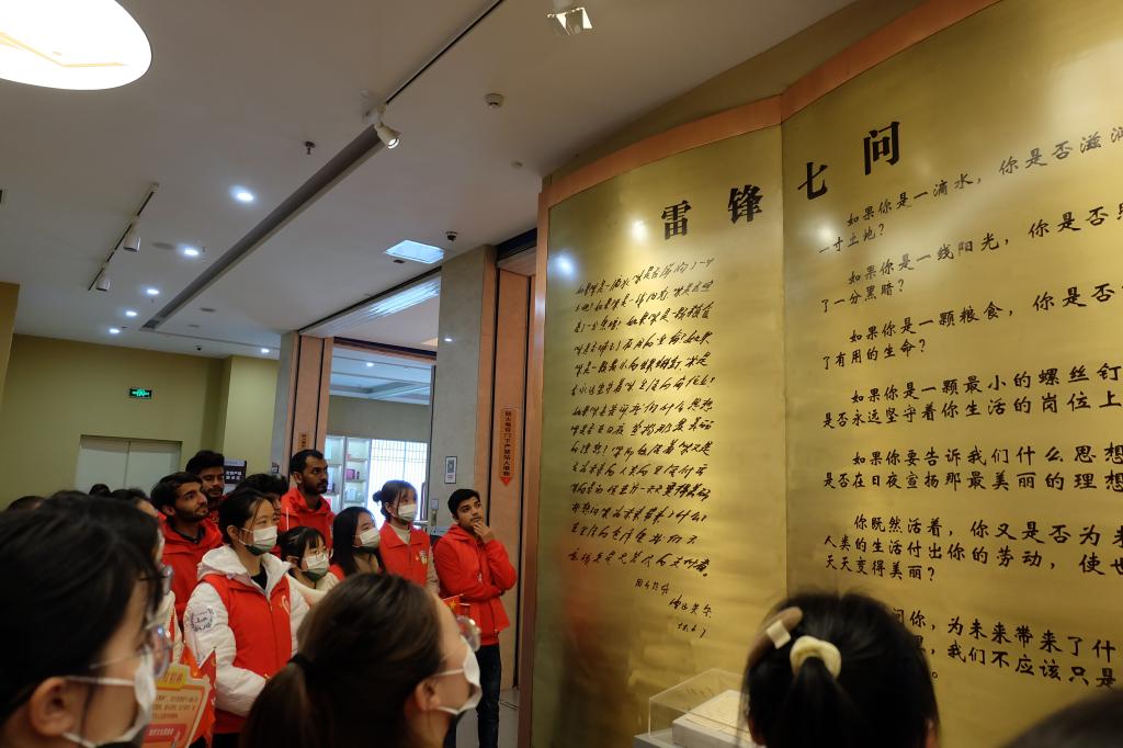 来自国际工学院巴基斯坦、阿富汗、索马里、孟加拉国、摩洛哥等国的留学生们在场馆“沉浸式”感悟雷锋服务人民、无私奉献、艰苦朴素等精神内涵,感叹中国正是因为有千千万万的“活雷锋”才有了日新月异的飞速发展和人民和谐幸福的生活。在雷锋纪念广场,留学生们与中国学生齐唱歌曲《学习雷锋好榜样》,在“雷锋家乡学雷锋,志愿服务正青春”的横幅上郑重地签上了自己的名字,响应《向雷锋学习的倡议书》。
