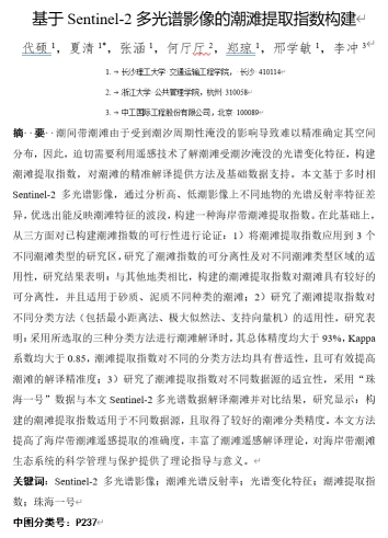 近日,我院测绘工程系夏清老师指导2020级01班的代硕、张涵两位本科生,在遥感领域知名中文期刊《光谱学与光谱分析》录用了一篇题为《基于Sentinel-2多光谱影像的潮滩提取指数构建》的文章(2023年12月出刊),该期刊被科学引文检索(Science Citation Index)。论文合作单位包括浙江大学及中工国际工程股份有限公司。该项目工作得到国家自然科学基金项目、湖南省自然科学基金项目和大学生创新创业训练计划项目(国家级)的共同资助。