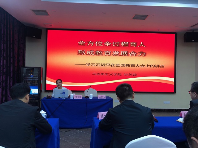 钟芙蓉作了题为《全方位全过程育人,形成教育发展合力》的讲课,从学习贯彻全国教育大会精神、深刻理解新时代教育工作的新使命、形成全方位全过程育人合力三个方面对全国教育大会精神进行解读。讲课中指出:教师要在教育教学工作中,做到“九个坚持”,坚定“四个意识”,牢固“四个形态”,深入学习贯彻党的教育路线、方针、政策,爱岗敬业,为人师表,教书育人;要争做新时代“四有”教师——有理想信念、有道德情操、有扎实学识、有仁爱之心;作为后勤人,要努力做到科技后勤、智慧后勤、人文后勤,形成高校育人共同体,形成全方位全过程育人合力,履行好自己“服务育人”的光荣使命。