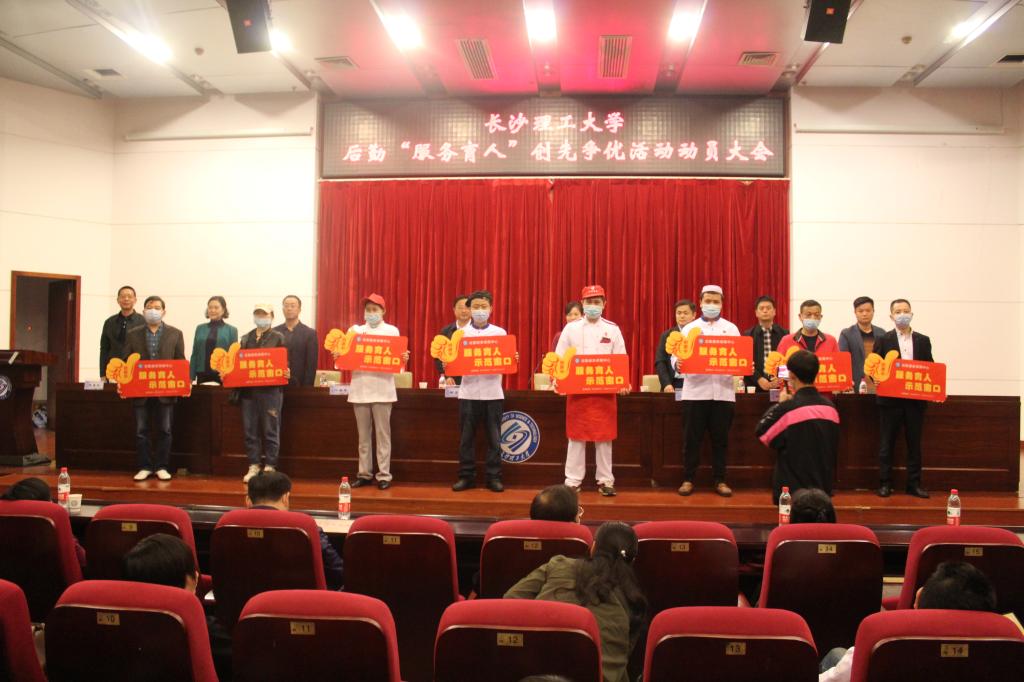 郭剑宣读了服务育人文化建设示范单位、服务育人示范窗口、服务育人示范平台、服务育人党员先锋岗、服务育人标兵岗等五个创先争优创建项目立项通知书。后勤中心副主任、分工会主席柳翼宣读了题为《立足岗位比奉献,服务师生做表率》创先争优活动倡议书。集体示范项目创建负责人代表、餐饮服务部主任李波和个人示范项目创建代表、云塘物业服务部值班员严咏群分别作了表态发言。与会领导为创先争优创建项目的集体和个人授牌并合影留念。
