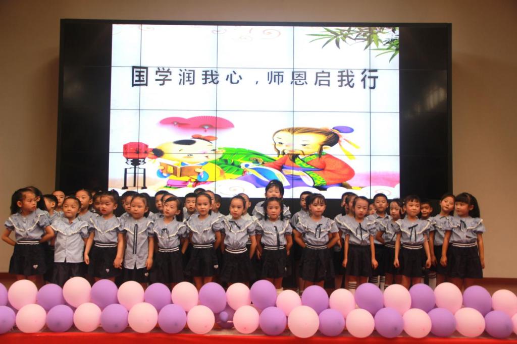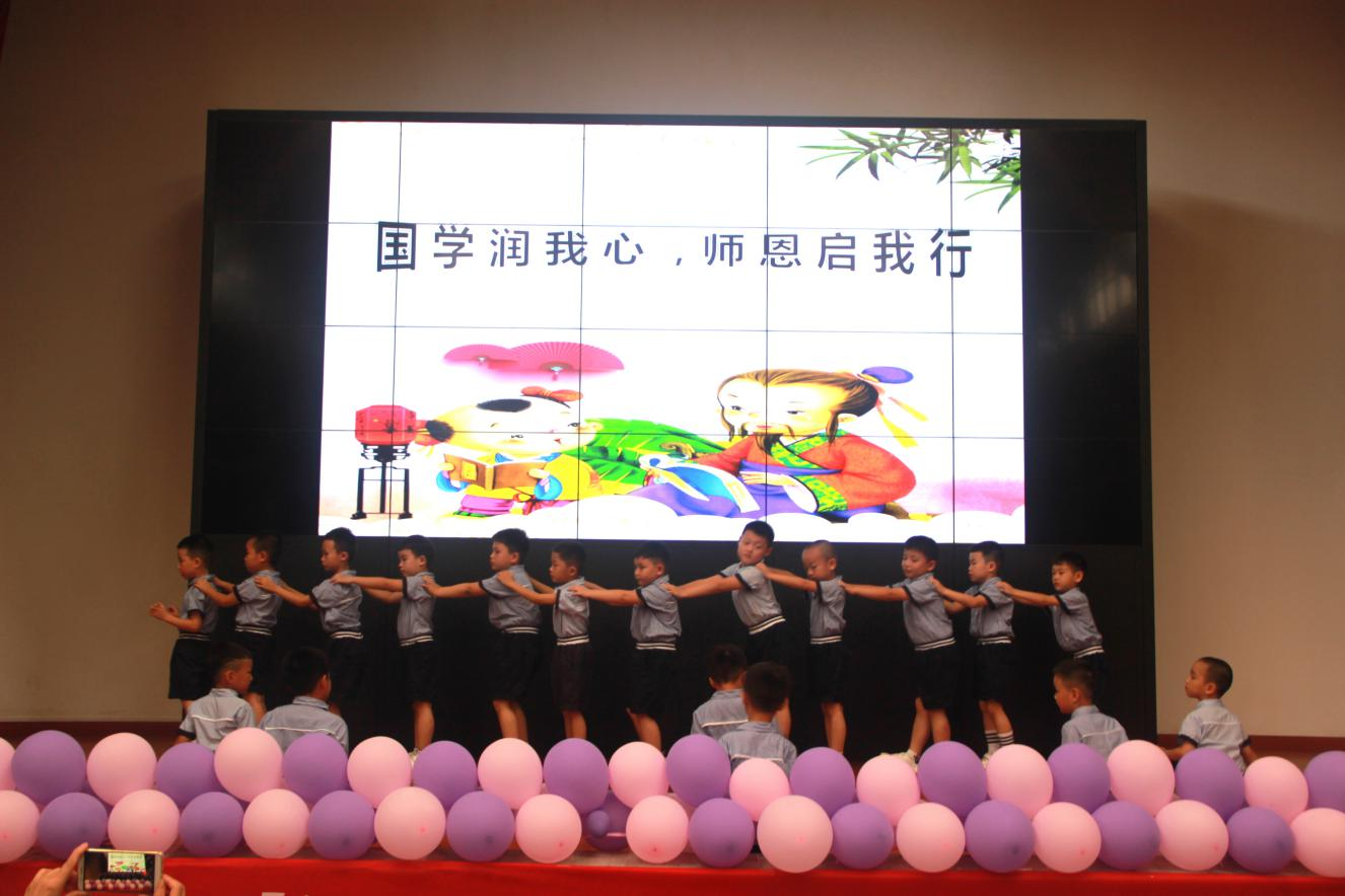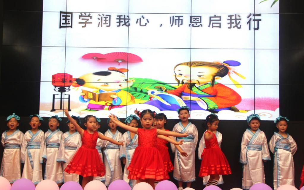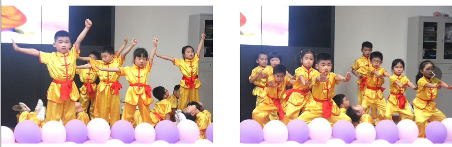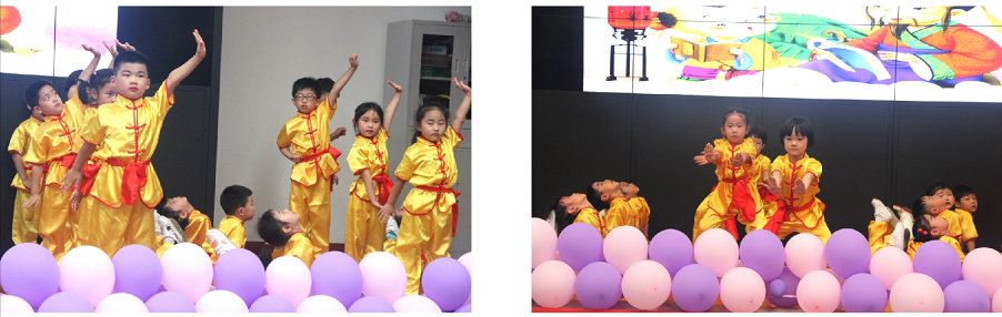 舞蹈《春晓》、《唐诗新唱》展示了孩子们朝气蓬勃的精神状态。“天地玄黄,宇宙洪荒……”,孩子们身着黄色服装,队列整齐、精神饱满,动作规范、整齐划一表演《国学武术操》。
