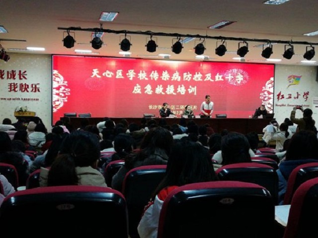 在第二场培训上,天心区疾控中心红十字会培训师旷小玲向教师们传授了两种医疗应急救援法。第一种应急救援法叫海姆立克急救法,也称“生命的拥抱”,如病人忽然气道进了异物呼吸困难,急救者应两脚前后分立站稳,将双臂分别从患者两腋下前伸环抱固定患者。左手握拳,右手从前方握住左手手腕,使左拳虎口贴在患者胸部下方,肚脐上方的上腹部中央,形成“合围”之势,然后突然用力收紧双臂,用左拳虎口向患者上腹部内上方猛烈施压,迫使其上腹部下陷、膈肌上升而挤压肺及支气管,这样每次冲击可以为气道提供一定的气量,从而将异物从气管内冲出。施压完毕后立即放松手臂,然后再重复操作,直到异物被排出。第二种应急救援法叫心肺复苏术也称CPR,如病人呼吸停止,急救者应及时呼救,确保病人仰卧,若仍不能恢复,就要进行胸外按压,按压要注意位置、力度、频率、深度,并在按压30次后仰头抬颏进行人工呼吸吹气2次,循环往复,直至患者恢复呼吸、心跳。