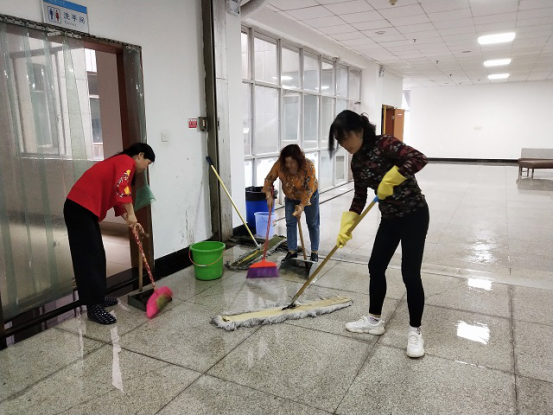 水是通过大便器流出来的,夹杂着粪便,臭气熏天。云塘物业员工打开厕所与书库之间的门,把书库的水清理到厕所通道,不怕苦,不怕脏,分成三队:一队在大厅用撮箕舀水,再装到水桶;一队在书库,几人合力把书库的水推到厕所通道;一队在厕所疏通。大家舀的舀,推的推,提水的提水,特别是白班值班员严咏群,一手拎一个水桶,眉头都不皱一下,全力清理。