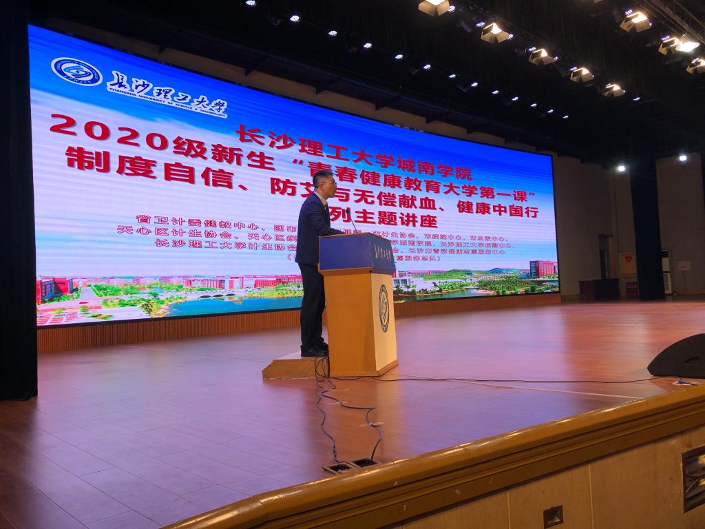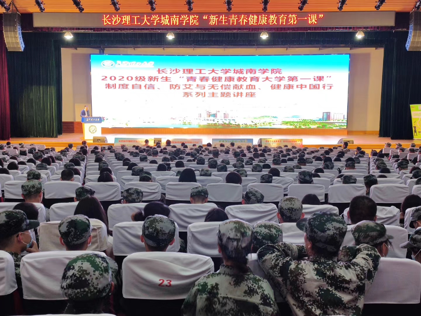 10月15日晚,由后勤中心与城南学院联合主办的“新生青春健康教育第一课”在金盆岭校区五教大礼堂举行。市卫健委党组成员兼市计生协会常务副会长胡平、市疾控中心党委书记刘艳、天心区计生协会常务副会长曹福新、后勤中心党委书记王明彦、城南学院党委副书记陶传谱及1800余名师生参加了此次活动。
