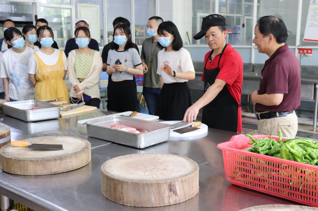 后勤餐饮部精心安排红案师傅现场教学,工作人员为学生们准备好了学做红案的食材和用具。餐饮服务部主任李波详细地向同学们讲解了进入后厨的各项注意事项,整个过程确保菜品卫生,在后厨时刻注意安全等。在清楚进厨房的安全要求后,同学们以小组为单位商量确定各自想要制作的菜肴,有序地跟着师傅依次进入后厨操作间切配。在“厨娘”的帮助下:同学们撕包菜,切肉等。最难切的是牛肉,牛肉肉质比猪肉粗略一些,刀和肉的纹理呈90度的垂直,切出来的肉片,纹路呈“井”字状。交通学院的女“厨师”黄攀刀法精妙,手法细腻,令人眼前一亮,吸引了大家的“眼球”,只见她切猪肉的时候顺着纹理,刀和肉保持在同一水平线上,飞快地把肉切成规则的小片。
