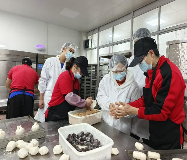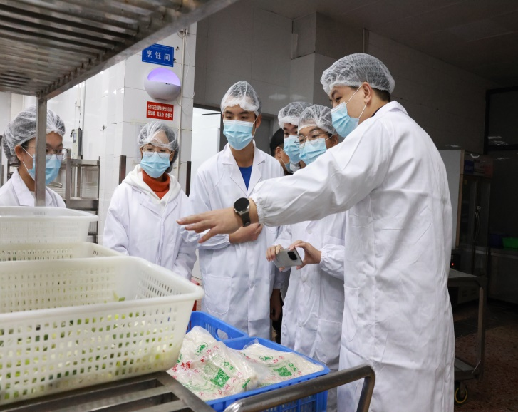 早上5:30,在食堂工作人员的带领下,同学们来到甘饴园、汀香园食堂,参与食堂原材料验收入库,并依次参观了食堂后厨加工间、白案房、蒸煮间、烹饪间等加工场所。下午2:00,同学们来到网上评选出的6个最受欢迎的特色档口后厨操作间,深入了解广式烧鸭、鲍汁黄焖鸡、蒜香茄条等菜品制作全过程。